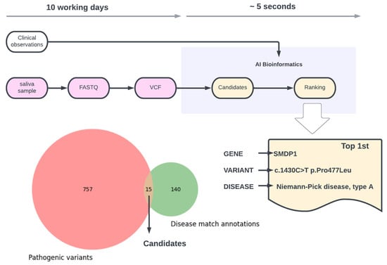 Whole Exome Sequencing (WES) using Next-Generation Sequencing (NGS) is a clinically accepted diagnostic technology for the identification of pathogenic genetic variants in children and adults [1]. Finding gene-function-disruptive variants (SNPs and INDELs) in sequences is fundamental in determining the cause of the genetic disease and for genetic counselling consultations. Additionally, the application of this method at the pre-conception stage can also enable parents to make informed decisions regarding the possible birth of children with a particular genetic disease. Databases such as ClinVar and OMIM have been accumulating information on an ever-increasing number of new pathogenic variants [2]. In these databases, gene–disease associations have also been growing over time, leading to more than eight thousand having been already reported [3]. Public and private healthcare facilities are beginning to use these data as a front-line tool over conventional techniques to diagnose pediatric rare genetic diseases [1,4]. However, the analysis of WES using bioinformatics is complex and requires specialist skills and training, hence it can take several weeks from sample to diagnosis [5]. The relative complexity associated with the high labor intensity is a substantial bottleneck in the field, leading to a heavy cost in human resources. This has been a limiting factor for the screening and prevention of rare diseases in the general population. Artificial Intelligence (AI) is considered to be a solution for automating complex analysis and decision-making [6]. In this work, we present two case studies where we applied an AI-driven bioinformatics framework in a diagnostic and a preventive scenario, respectively.