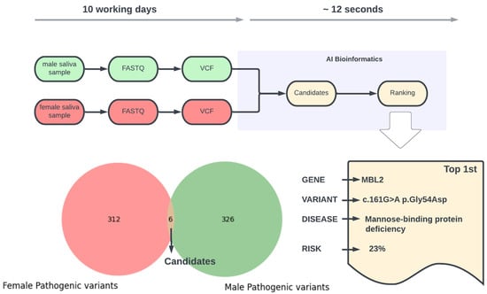 In this case, we screened a healthy couple at the pre-conception stage for their potential risk of having a child affected by a genetic disease. We applied AI-driven bioinformatics on the male and female exomes containing about 112,000 and 113,000 gene variants, respectively (Figure 2). The AI took ~12 s to identify six putative pathogenic gene variants that can be transmitted from both males and females. From these, only one raised some concern based on strong gene–disease association evidence, with an estimated probability of 23% of having a child with mannose binding deficiency.