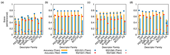 Values of different scores (overall accuracy, f(Q1|Q1) and f(Q1|Q4) scores) for each family of descriptors and algorithms: (a) logistic regression; (b) decision tree; (c) random forest, and (d) AdaBoost. The f(Q1|Q1) score refers to the fraction of data points belonging to Q1 rightfully classified as Q1, whereas f(Q1|Q4) refers to the fraction of data points in the Q4 range wrongfully classified as Q1.