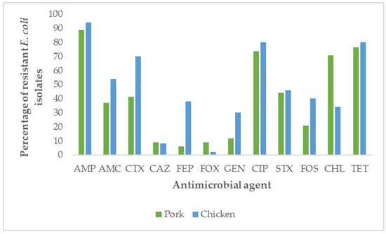 Highest Priority Critically Important Antimicrobial Resistant Escherichia coli and Salmonella spp. Isolated from Pork and Chicken Meat from Argentina †