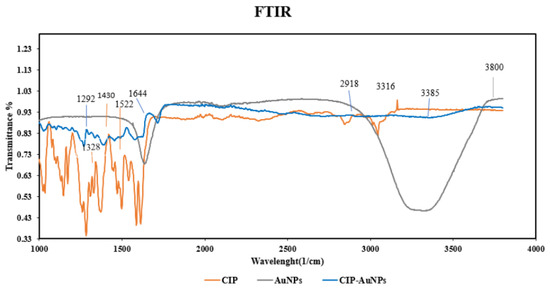 FTIR of CIP, AuNPs and CIP-AuNPs.