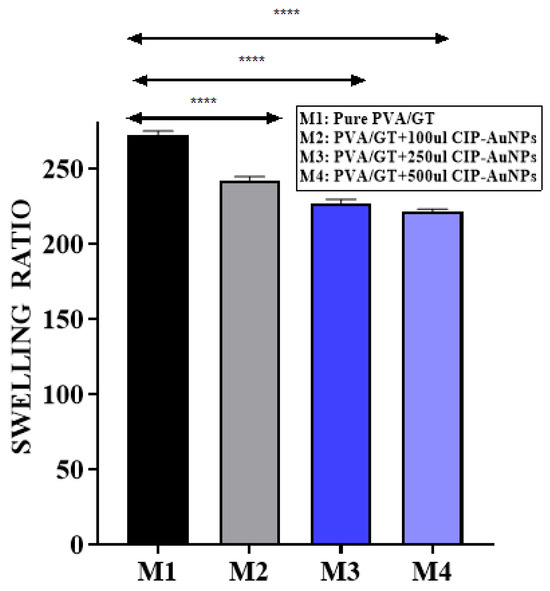 Swelling ratio of pure PVA/GT, PVA/GT loaded with 1% CIP-AuNPs, PVA/GT loaded with 2.5% CIP-AuNPs, PVA/GT and PVA/GT loaded with 5% CIP-AuNPs. **** shows statistically significant results as the p value is less than 0.005.