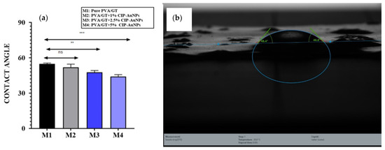 The contact angle of (a) pure PVA/GT, PVA/GT loaded with 1% CIP-AuNPs, PVA/GT loaded with 2.5%CIP-AuNPs, and PVA/GT loaded with 5% CIP-AuNPs. ns shows statistically insignificant results as the p value is greater than 0.005, while *** and ** shows statistically significant results as the p value is less than 0.005. (b) The contact angle of PVA/GT loaded with 5% CIP-AuNPs.