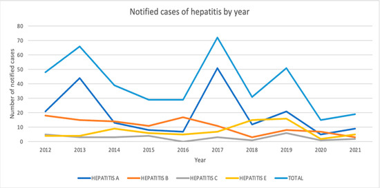 The total number of notified cases tends to follow the rise and fall of case of hepatitis A cases, which are the most numerous and present the highest magnitude of change (Figure 1).