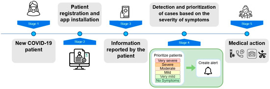 The StepCare system operates through structured process designed to optimize patient management and healthcare resource allocation (Figure 1). Upon diagnosis or identification of COVID-19 symptoms, patients completed an initial risk-profile questionnaire via a hospital-provided web application. This profile enabled StepCare to personalize symptom monitoring questions according to the patient’s characteristics.