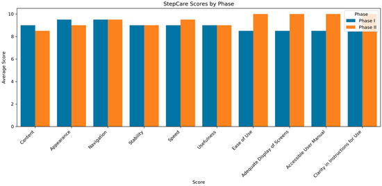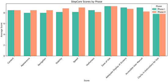 Comparison of average usability scores between Phase I and Phase II for StepCare, as evaluated by healthcare professionals.