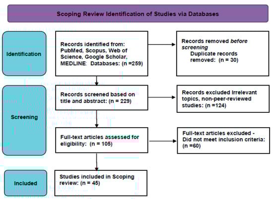 A total of 259 records were identified, and after screening and eligibility assessment, 45 studies were selected for full-text analysis (Figure 1) [12].