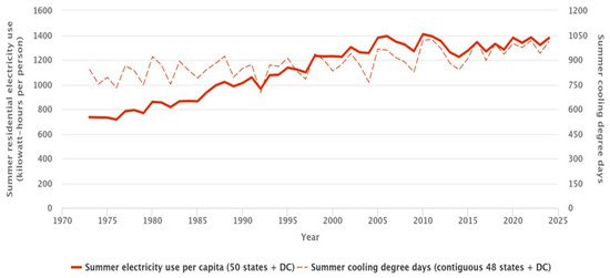 Residential Summer Electricity Use Per Capita and Summer Cooling Degree Days in the United States, 1973–2024 [16].