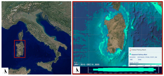 This study offers a methodological approach to monitor the impacts of deep-sea trawl fishing by combining methods and instruments for collecting data at different spatiotemporal scales and levels [12,13]. The research question will be addressed within the context of Sardinia, Italy (Figure 1). The choice of this area is justified by the fact that Sardinia presents a compelling case to examine the impacts of deep-sea fishing, as it is an island that greatly relies on its coastal and marine resources for economic development. In addition, Sardinia is crucial for preserving rich Mediterranean biodiversity, with its regional network of marine protected areas that make the island a biodiversity sanctuary for species that are found nowhere else on Earth. However, the proposed methodology is not intended to be exhaustive; it rather simulates a protocol for identifying the primary fishing hotspots and collecting in situ data on deep-sea trawl fishing.