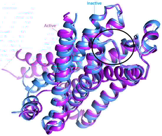 Structural comparison of the β2-adrenergic receptor (β2AR), a G-protein-coupled receptor (GPCR), in its active (PDB ID: 3SN6, shown in purple) and inactive (PDB ID: 2RH1, shown in blue) conformations. The black circle highlights the orthosteric binding site, which remains structurally conserved between the active and inactive states. This alignment illustrates that despite large conformational differences elsewhere in the protein, the binding pocket retains a similar architecture in both functional state.