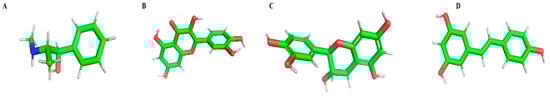 Three-dimensional structures of natural ligands used in the study: (A) ephedrine, (B) quercetin, (C) catechin, and (D) resveratrol. Atoms are color-coded as follows: Carbon (C): green, Hydrogen (H): white, Oxygen (O): red, Nitrogen (N): blue (visible in ephedrine only). Molecular geometries were optimized and rendered using UCSF Chimera version 1.16.