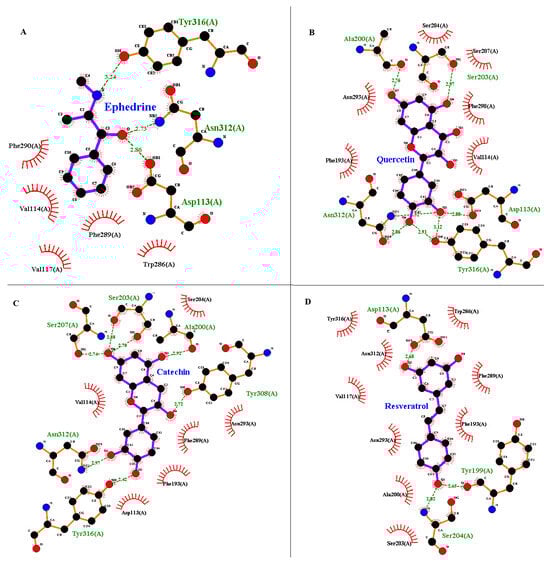 LigPlot+ interaction diagrams illustrating the binding modes of natural ligands to the β2-adrenergic receptor (β2-AR): (A) ephedrine, (B) quercetin, (C) catechin, and (D) resveratrol. Hydrogen bonds are shown as green dashed lines with bond distances labeled in Ångströms. Red arcs represent non-ligand residues involved in hydrophobic contacts. Key interacting residues such as Asp113, Ser203, Asn312, and Tyr316 are involved in stabilizing the ligand within the orthosteric binding pocket.