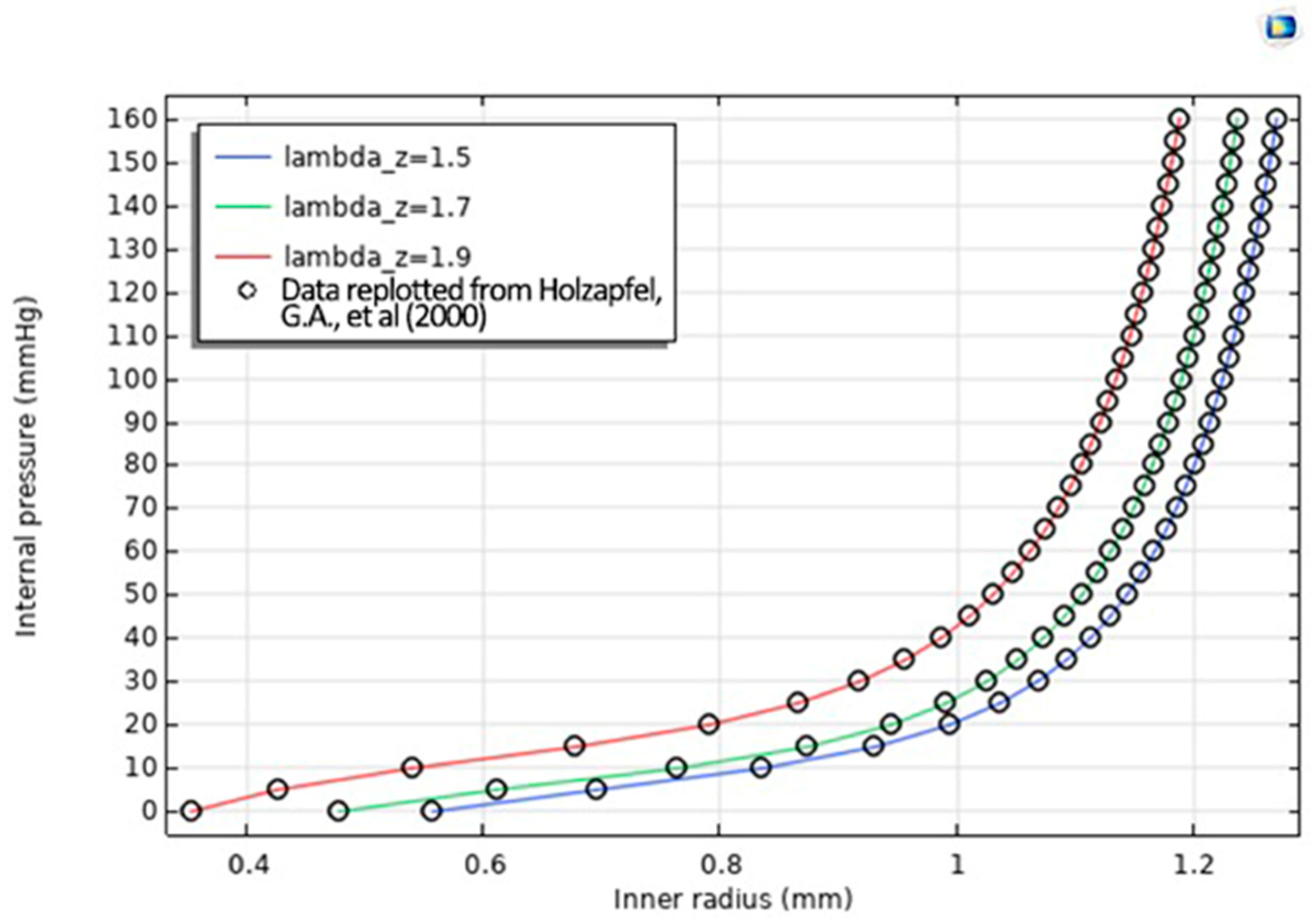 16] in which Simulated inner-radius expansion vs. pressure for λ_z = 1.5, 1.7, 1.9 reproduces the graft’s J-shaped stiffening curve, with λ_z = 1.9 (red) closely matching experimental data (black circles) to validate the bi-material model.