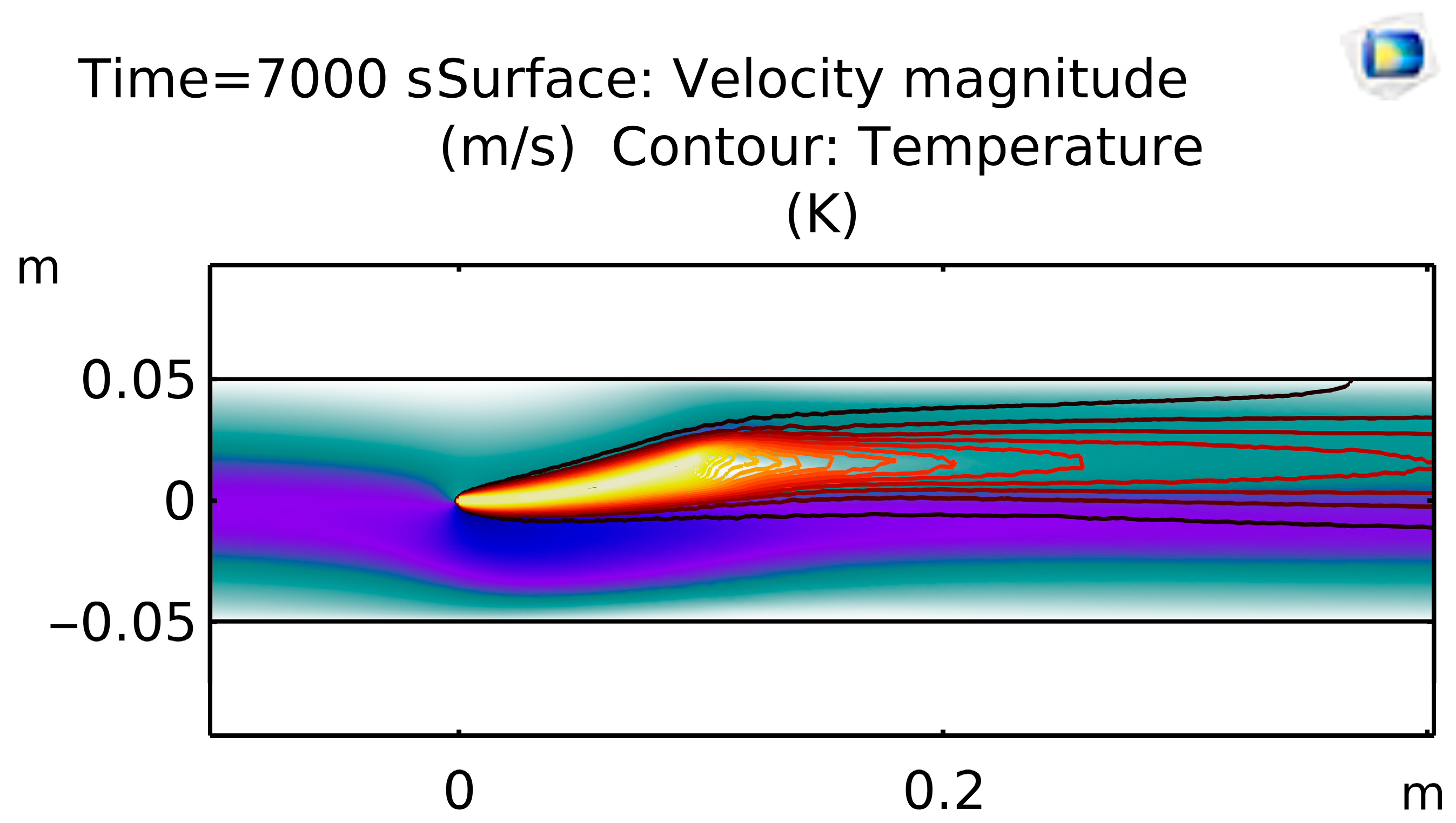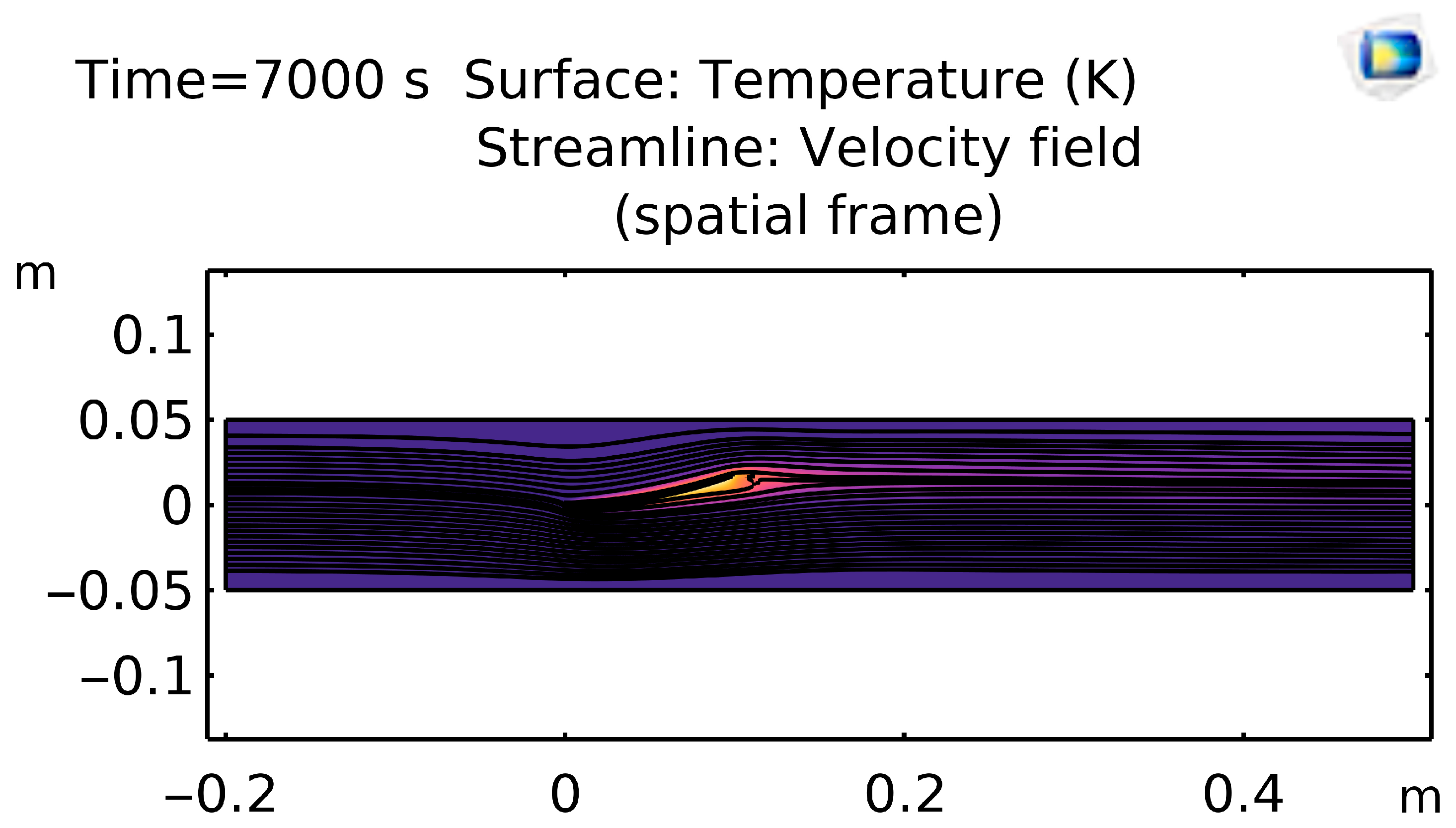 Velocity was set to zero at the inlet and ramped linearly to 0.2 m/s over 3000 s. Likewise, after 5000 s, the inlet temperature ramped up to 593.15 K from its initial setting of 293.15 K (room temperature) (