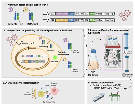 Workflow for the generation, production, and characterization of ImmTACs. The process begins with the construct design and production of lentiviral vectors (LVVs) for Tebentafusp and IMDA-001, encoding ScFv fused to TCR chains with StrepTag and HisTag for purification (1). ImmTAC-producing CHO cell lines are established via LVV infection, leading to secretion of Tebentafusp and IMDA-001 in fed-batch culture, with ZsGreen expression serving as a reporter (2). Proteins are purified from the concentrated culture supernatant using HisTrap and StrepTrap columns (3). Quality control is performed through protein quantification (BCA assay) and purity analysis (SDS-PAGE) (6). Finally, in vitro characterization of ImmTACs is carried out to evaluate T cell activation, cytokine release, and cytotoxic activity against target cells (5).