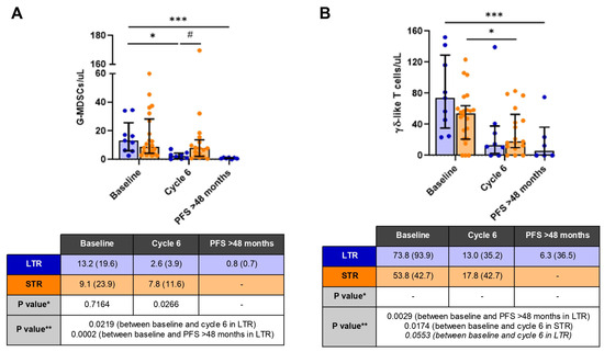 Concentration of G-MDSCs (A) and gd-like T cells (B) during the follow-up of long-term responder (LTR, blue) and short-term responder (STR, orange) patients in the progression-free survival dataset. Results are reported as median and interquartile range. Asterisks (*) indicate statistically significant differences between different measurements within the same patient group, * p ≤ 0.05 and *** p ≤ 0.001. Hashtags indicate statistically significant differences between the two patient groups for the same measurement, # p ≤ 0.05. In the tables, * means that data were analyzed using the Mann–Whitney U test, and ** means that data were analyzed using the Wilcoxon test for two groups (STR) and the Friedman test for three groups (LTR), with Dunn’s test to check comparisons between each independent group.