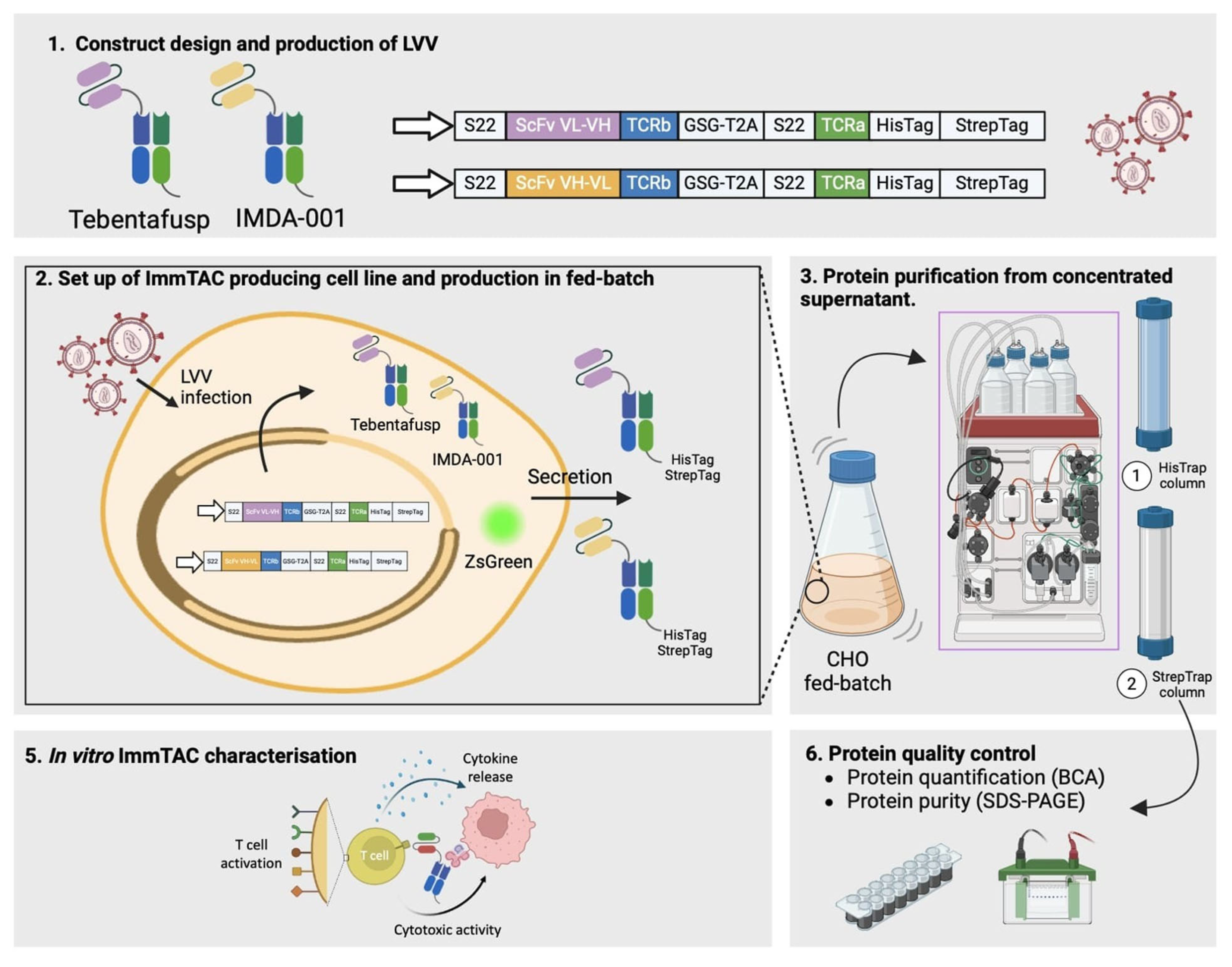 Chinese Hamster Ovary (CHO-S) cells were transduced with lentiviral vectors encoding the ImmTAC cDNA and sorted using the ZsGreen reporter. For protein production, ZsGreenhi CHO-S cells were cultured in fed-batch until viability dropped below 60%. The secreted protein was purified from concentrated supernatant using a two-step affinity chromatography. Protein yield and purity were evaluated using BCA assay and SDS-PAGE. ImmTAC functionality was validated by in vitro T cell cytotoxicity against gp100280-288-pulsed A2+ targets.