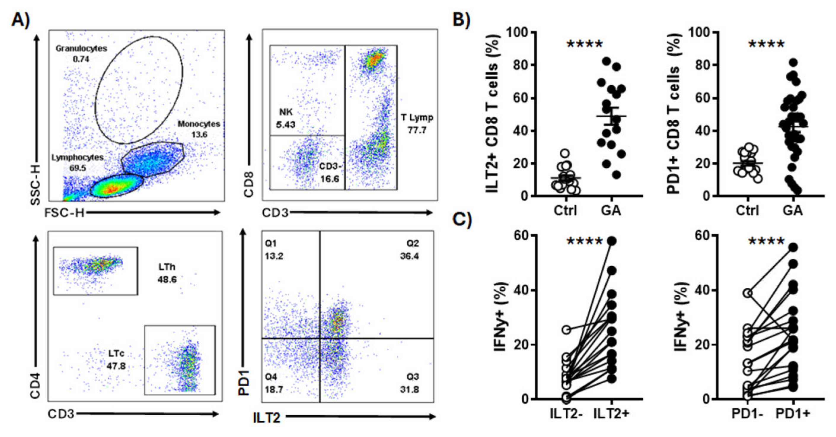 We found increased expression of PD1 and ILT2 in CD8 T cell lymphocytes from PBMCs of patients (42.5% and 49.0%) compared to controls (20.2% and 11.2%, respectively,