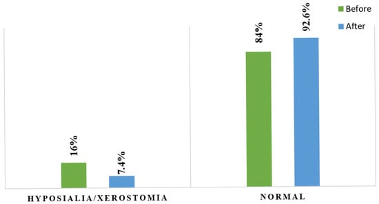 At baseline (T0), 13 patients (16%) were classified as having hyposialia (USFR < 0.1 mL/min and/or SSFR < 0.7 mL/min), while 68 (84%) presented normal salivary flow (Table 1). After 15 days of treatment (T1), the prevalence of xerostomia dropped to 7.4% (n = 6), while 92.6% (n = 75) exhibited normal salivary flow (Table 2). Fisher’s Exact Test confirmed a statistically significant difference in xerostomia prevalence before and after treatment (p < 0.001), demonstrating the efficacy of the topical sialogogue in reducing drug-induced xerostomia among psychiatric inpatients (Figure 1).