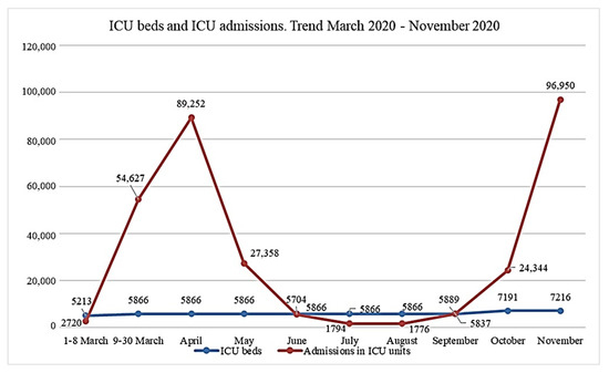 This study analyzes the daily trend of ICU beds and admissions for COVID-19 in Italian public hospitals between 2 March and 30 November 2020 [9].
