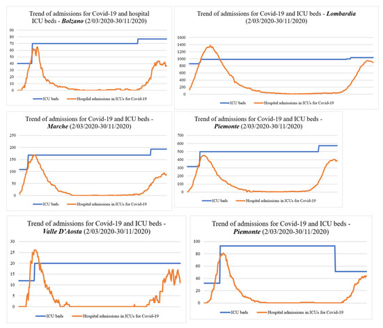 Data were obtained from the official website of the Italian Health Ministry (http://www.salute.gov.it/nuovocoronavirus, accessed on 15 December 2020) that reports information of COVID-19 infection in Italy, and from the website of the National Agency for Regional Health Services (Agenas—Agenzia Nazionale per i Servizi Sanitari Regionali) (https://www.agenas.gov.it/covid19/web/index.php, accessed on 15 December 2020) that contains information of hospital ICU bed trend in Italian regions.
