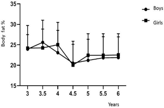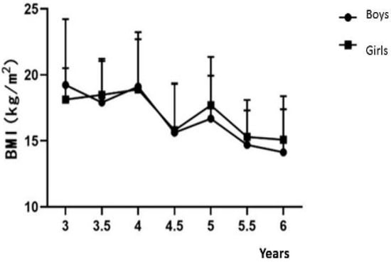 There was no gender difference in the body fat percentage of boys and girls (Table 7, p = 0.328, p > 0.05). The body fat percentage of children aged 3–4 was higher than that of 4.5–6-year-old subjects, and the difference was statistically significant (p < 0.01). The percentage of body fat of children aged 3–6 years showed a downward trend with age (Figure 1).