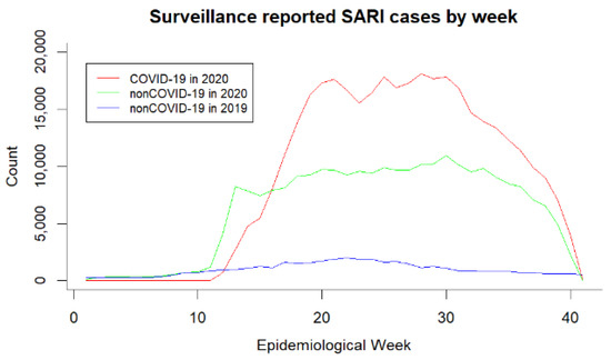 The data used for this analysis are publicly available from IVIS Platform (Plataforma Integrada de Vigilância em Saúde) under the Ministry of Health of Brazil were last updated on 13 October 2020 [6]. More specifically, it consists of hospitalized SARI patients reported in SIVEP Gripe (Sistema de Informação de Vigilância Epidemiológica da Gripe) surveillance system, which is used to report individuals of any age hospitalized with fever and cough or throat pain and who have dyspnea or O2 blood saturation <95% or respiratory discomfort [7]. Additionally, there are reported cases of death caused by SARI independent of hospitalization status [7]. For the purposes of our analysis, we used the dataset of SARI cases reported in 2020, which is the main focus; in addition, the 2019 dataset is used to compare the time trends of cases.