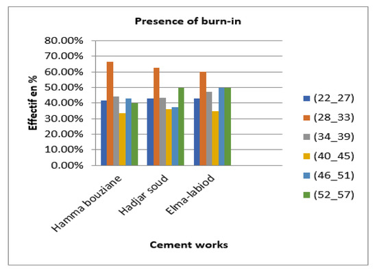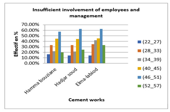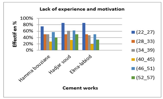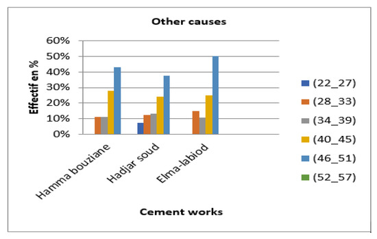 Finding: These results (Figure 1) clearly show that the categories of employees most affected by this cause in the three cement plants are the youngest and least experienced age groups (22–27). This may be due to a lack of experience and a low level of training and information. However, for the oldest age group (46–51), this may be due to a lack of motivation in preparing for retirement. The same remarks apply for the three cement factories.