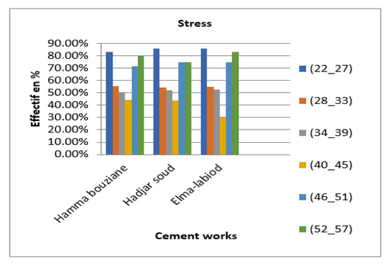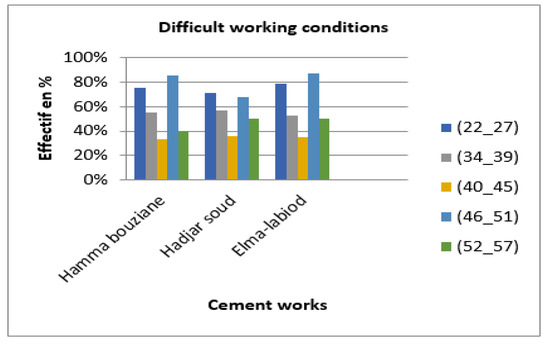 Finding: As the main cause of a high number of accidents at work in cement factories, we note here that the category of young employees (22–27) and the category of older employees (46–51) and (52–57) are the most affected (Figure 4). This can be explained for young employees by the fact that they are not yet used to their work and also by the nature and working conditions that require physical and mental effort. However, for the other two categories, the more experienced suffer from stress due to the very difficult working conditions, age, and responsibility. The same remarks apply to the three cement plants.