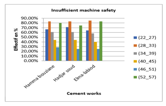 Finding: Here, we note that the categories of employees (28–33) and that of (52–57) are the most affected by the category of insufficient machine safety as a cause of work accidents (Figure 3). In our view, this can be explained by the category (28–33) that has already acquired some experience and by their direct exposure to the different machines, since most of them are operators and therefore usually face the different machines on site. However, for the most experienced category of workers (52–57), this is due to the different workplaces occupied during their careers and their repeated exposures to different unsecured machines. The same remarks apply to the three cement plants.