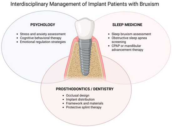 Bruxism in the context of implant dentistry is best managed not as a single-domain problem but as a complex, multidimensional condition in which psychological stressors, sleep physiology, biomechanics, prosthetic design and materials, and long-term maintenance interact. Based on the preceding synthesis, we propose a structured, interdisciplinary model that (1) identifies at-risk patients early; (2) quantifies and characterizes the load environment objectively; (3) applies prosthetic and clinical measures to minimize overload; (4) treats upstream psychosomatic and sleep drivers; and (5) monitors outcomes with scheduled surveillance and adaptive interventions.