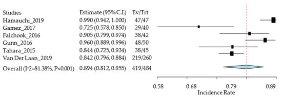 This systematic review assessed the following research question: ‘What is the incidence of OM, as well as the respective degrees, in the context of treatment (RT/QT/surgery) of patients with head and neck cancer?’ Articles published between 2015 and 2020, adult patients (≥18 years), and articles that present the incidence of OM in patients during and/or after treatment for head and neck cancer were included. The search was carried out using three databases: PubMed, B-on, and Google Scholar. Six articles were included in the systematic review and in the meta-analysis. The formula [OM incidence = patients with OM/total sample] was used to determine the incidence. Random effect meta-analysis statistics and graphs were performed using Open Meta [Analyst] in its current version.