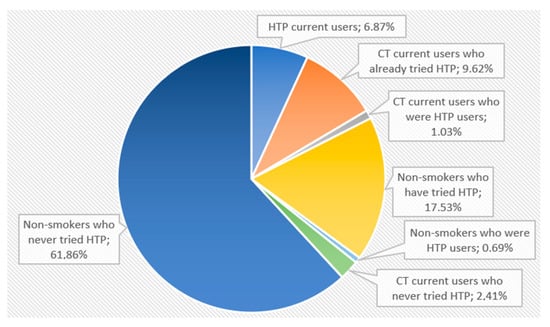 This study, which covered a sample of 314 participants, demonstrated that 19.93% (n = 58) of the students were smokers, 6.87% (n = 20) smoked heat-not-burn tobacco and 13.06% (n = 38) smoked combustion tobacco (Figure 1), thus, the prevalence of HTP represents more than a third of all smokers (34.47%). This prevalence, 6.8%, is much higher than the prevalence of 0.5% reported recently by Gallus et al., relative to a study conducted in Portugal in 2017 [6].
