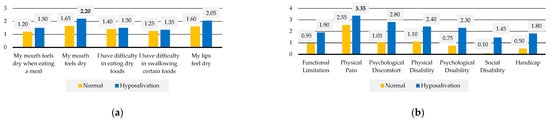 The overall OHIP-14sp scores ranged from 0 to 51, with a mean of 11.50 (± 12.98). The mean score of OHIP-14sp was higher in patients with hyposalivation (16.0 ± 15.8). The results demonstrate a statistically significant correlation between OHIP-14sp scores and hyposalivation (p = 0.0425) (Table 1). The dimension of OHIP-14sp with higher impact was “Physical Pain” (3.35 ± 2.81) (Figure 1b).