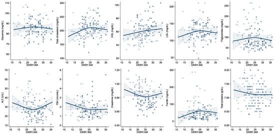 No substantial differences emerged in the analysis stratified by sex (Figures S6–S21) with some exceptions. For the DASH diet, the relation with hemoglobin was almost linear, while in men it decreased above high levels of adherence (>25) only. In addition, the inverted U-shaped relation between DASH and platelets was confirmed in men, while a linear increase can be noted in women (Figures S6 and S7).