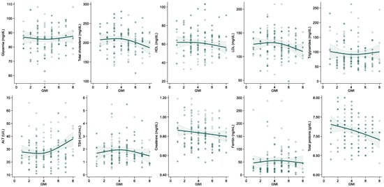 The spline regression analysis for the association between adherence to dietary patterns and metabolic parameters is presented in Figure 1, Figure 2, Figure 3 and Figure 4. For glycemia, no substantial association was found for any of the patterns, while total cholesterol showed an inverse association for scores above median values for DASH (≥25), GMI (≥4) and IMI (≥4). Conversely, an inverse linear association emerged for the MIND diet. HDL cholesterol was found to be directly associated, almost linearly, with increasing scores of the DASH diet and the IMI. At the same time, the relation was almost null for the GMI and U-shaped for the MIND diet, slightly decreasing at below-median adherence and again increasing for scores above it. For LDL cholesterol, we found comparable results for all dietary patterns with inverse associations, especially for scores indicating high adherence, except for the DASH diet, with a slight but imprecise increase up to the median score (25), after which they started to decrease. Similarly for triglyceride levels, we found an almost inverse association for the IMI and MIND diet but null with the GMI and comparable to the shape of LDL cholesterol for the DASH diet. ALT showed a U-shaped association with the DASH diet (inverse up to a score of 25 and direct above that). Likewise, for the GMI diet, an increase in ALT was noted but only for high scores (≥4), while both the MIND diet and the IMI showed an almost null association. TSH showed an inverse relation with the DASH and MIND diets, while the relation was almost null with a slight decrease for high adherence scores for the GMI and U-shaped for the IMI with the median value (4) being the turning point of the curve. Creatinine showed a U-shaped relation with the DASH and IMI diets, with an inverse relation up to median adherence values. Conversely, the GMI was inversely associated, while the MIND diet had an almost null association. Ferritin showed a nearly linear direct association with all patterns except for the GMI, the latter demonstrating a null relation. In addition, a plateau was reached at a higher adherence score for the DASH diet. Total protein levels showed inverse associations with all dietary patterns, especially at high adherence scores for the MIND diet, while the effects seemed to wane for the DASH diet.