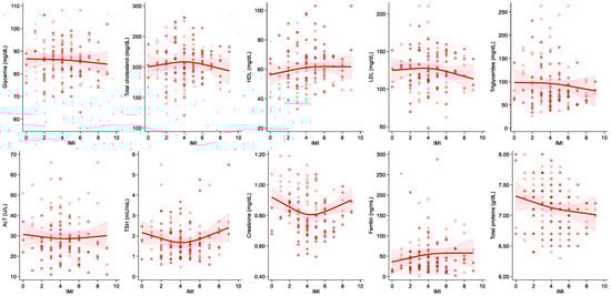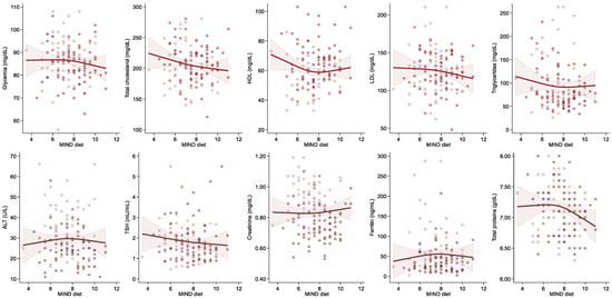 The spline regression analysis for the associations between adherence to dietary patterns and blood cell counts and biochemistry is reported in Figures S2–S5. Red blood cell count, hemoglobin and hematocrit were almost entirely inversely correlated with all dietary patterns. There was an inverted U-shaped relation between platelets and DASH (direct association up to a score of 25, inverse above that) and MIND (slight direct association up to the score of 8, inverse above that). In contrast, null associations emerged between the GMI and IMI, though for the latter an inverse relation was observed for scores above eight.