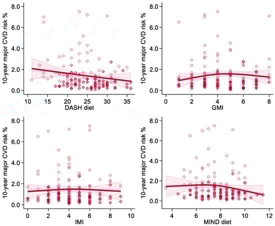 Adherence to the investigated dietary patterns was determined through a previously developed routine from the amount and frequency of consumption of the individual components assessed through the FFQ [49,50]. We modeled the relation between adherence to the investigated dietary patterns and the biochemical and metabolic parameters using restricted cubic spline regression multivariable analysis with three knots at fixed cutpoints (10th, 50th and 90th percentiles) to evaluate the possible nonlinear association according to Harrell’s recommendations [58]. We used a multivariable model adjusted for the following variables: age, sex, BMI, urinary cotinine, alcohol intake, fiber intake and total energy intake. Similarly, we assessed the relation between adherence to dietary patterns and the 10-year risk of major cardiovascular events using the same spline regression analysis with three knots at fixed cutpoints and using a multivariable model adjusted as before but excluding sex, which is already included in the 10-year CVD risk calculation. We used STATA-SE statistical software (Version 17.0, Stata Corp., College Station, TX, USA, 2021) for all data processing and analysis, using ‘mkspline’ and ‘xbrcsplinei’ commands.