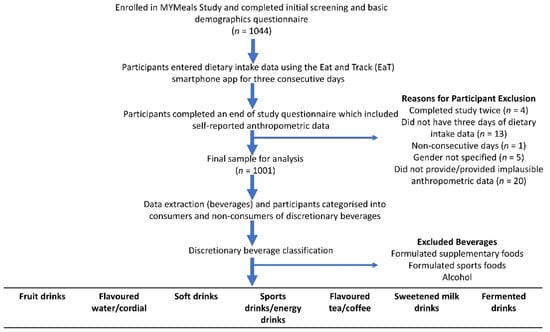 This project utilised the data from a cross-sectional study known as the MYMeals study, the protocol for which has previously been published [3,7,20]. For participants to be eligible, participants needed to meet the following inclusion criteria: (1) aged 18–30 years; (2) English-speaking; (3) an owner of a smart phone and (4) consume at least one beverage, meal or snack outside of home per week [7,20]. Participants were excluded if they: (1) failed to meet the inclusion criteria; (2) were not able to record dietary intake over a three-day period; (3) had ever been diagnosed with an eating disorder and/or (4) were pregnant or breastfeeding [7,20]. See Figure 1 for a flow chart of the study design. The study was approved by the University of Sydney Human Research Ethics Committee (project 2016/546).