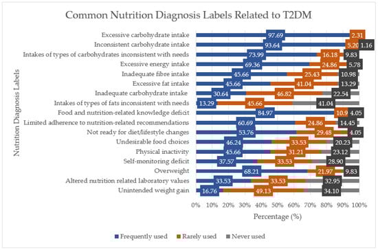 The second step of the NCP is nutrition diagnosis. Figure 1 shows the nutrition diagnosis labels commonly identified by dietitians when managing T2DM cases. The top five frequently used labels were excessive carbohydrate intake (98%), inconsistent carbohydrate intake (94%), food- and nutrition-related knowledge deficit (85%), intakes of types of carbohydrates inconsistent with needs (74%) and excessive energy intake (69%). These labels are among the common nutrition diagnosis labels for individuals with T2DM [16]. Out of the 17 nutrition diagnosis labels provided, unintended weight gain and intakes of types of fats inconsistent with needs (83% and 87%, respectively) were in the category of rarely used or never used. No significant differences were observed between sectors (p-value > 0.05).