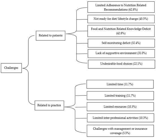 Under the open comment section, dietitians were asked to identify the key challenges they faced when managing T2DM cases. Themes that emerged were challenges related to patients or practice (Figure 2). Limited adherence to nutrition-related recommendations was the most frequently mentioned challenge (62.8%). Other challenges related to patients were the lack of readiness for diet/lifestyle changes (45.5%), food- and nutrition-related knowledge deficit (42.8%), self-monitoring deficit (43.4%), lack of supportive environment (31.0%) and undesirable food choices (22.1%). For challenges related to practice, dietitian reported to experience limited time (11.7%), limited training (11.7%), limited resources (10.3%), limited inter-professional activities (10.3%) and challenges with management and insurance coverage (5.5%). Some of the example quotes were: