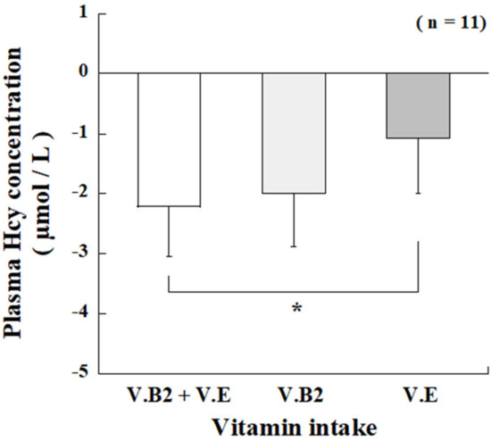 Comparison of the reduction in plasma homocysteine (Hcy) concentration after vitamin (V.B2) and/or vitamin E (V.E) administration. There was a significant difference between the vitamin B2 (V.B2) + vitamin E (V.E) period and the V.E period (* p < 0.05). The lowest plasma homocysteine (Hcy) concentration was in the V.B2 + V.E period. Plasma Hcy concentration decreased (pre−treatment to post−treatment [µmol/L] from 6.4 ± 1.0 to 4.2 ± 1.1 in the V.B2 + V.E period (p < 0.001), and from 10.1 ± 0.7 to 8.1 ± 1.0 in the V.B2 period (p < 0.001), and in the V.E period it also decreased from 8.7 ± 1.1 to 7.7 ± 1.2 (p < 0.05). In Japan, the reference value of plasma Hcy concentration is 3–15 µmol/L. In this study, all fluctuations were within the standard value. V.B2, vitamin B2; V.E, vitamin E; Hcy, homocysteine.