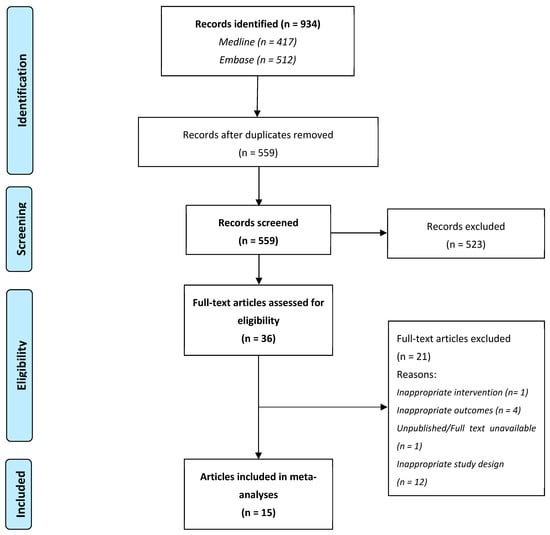 Two reviewers (J.G. and G.L.) independently extracted the data. Disagreements about the inclusion of studies were resolved by arbitration between co-authors. From a total of 934 records, 559 studies were identified after duplicates had been removed (Figure 1). Title and abstract screenings were facilitated by Covidence software. A total of 523 studies were excluded as a result of the screening process. Full-text assessment of 36 studies revealed 15 studies suitable for meta-analysis. Relevant data included data regarding TC concentration, LDL-C concentration, HDL-C concentration, TG concentration, FBG concentration, BP, body weight, and associated variance measures; first authors’ surname, publication year, and country of origin; sample size, design, and duration of study; baseline characteristics of sample including mean age, sex, and BMI; and type of intervention and control diet. Mean values were calculated for baseline participant characteristics. We evaluated the risk of bias coupled with the method of random sequence generation, allocation concealment, blinding, selective reporting, loss to follow up, and completeness of reported outcome data.
