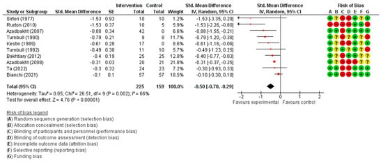 A total of 10 studies were included in this meta-analysis. The total sample size was 384 (225 in the intervention groups and 159 in the control groups; median sample size 31; range 15–114) and the mean age of the participants was 50.9 years. The median duration of the studies was 6 weeks (range 3–208 weeks). In the trials, replacement of meat with mycoprotein or plant-based meat substitutes was associated with a highly significant reduction in TC concentration (−0.50 mmol/L; 95% CI, −0.70 to −0.29; p < 0.00001; I2 = 66%; p = 0.002 for heterogeneity) compared with the consumption of comparator diets (Figure 2). In the one-study-removed sensitivity analysis, TC concentration findings had some diversity, with differences between the intervention and control groups ranging from −0.40 to −0.61 mmol/L (Supplementary Table S2). The removal of three studies [10,15,16] reduced the TC effect heterogeneity from 66 to 0% and changed the mean reduction in TC to −0.32 (−0.38 to −0.26) (Supplementary Table S3). The certainty of this evidence is moderate (Table 2).