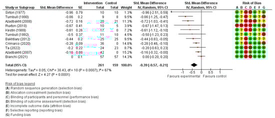 Eleven clinical trials were included in this meta-analysis. The total sample size was 420 (261 in the intervention groups and 159 in the control groups; median sample size 36; range 15–114) and the mean age of the participants was 50.8 years. The median duration of the studies was 6 weeks (range 3–208 weeks). In the trials, replacement of meat with mycoprotein or plant-based meat substitutes was associated with a highly significant reduction in LDL-C concentration (−0.39 mmol/L; 95% CI, −0.57 to −0.21; p < 0.0001; I2 = 67%; p = 0.0007 for heterogeneity) compared with the consumption of comparator diets (Figure 3). In the one-study-removed sensitivity analysis, LDL-C concentration findings had some diversity, with differences between the intervention and control groups ranging from −0.33 to −0.45 mmol/L (Supplementary Table S2). The removal of three studies [11,13,16] reduced the LDL-C effect heterogeneity from 67 to 0% and changed the mean reduction in LDL-C to −0.60 (−0.76 to −0.43) (Supplementary Table S3). The certainty of this evidence is low (Table 2).