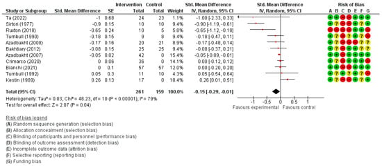 Eleven clinical trials were included in this meta-analysis. The total sample size was 420 (261 in the intervention groups and 159 in the control groups; median sample size 36; range 15–114) and the mean age of the participants was 50.8 years. The median duration of the studies was 6 weeks (range 3–208 weeks). In the trials, replacement of meat with mycoprotein or plant-based meat substitutes was associated with a small reduction in TG concentration (−0.15 mmol/L; 95% CI, −0.29 to −0.01; p = 0.04; I2 = 79%; p < 0.00001 for heterogeneity) compared with the consumption of comparator diets (Figure 6). In the one-study-removed sensitivity analysis, TG concentration findings were slightly affected, with differences between the intervention and control groups ranging from −0.20 to −0.05 mmol/L (Supplementary Table S2). The removal of three studies [10,12,17] reduced the TG effect heterogeneity from 79 to 0% and changed the mean reduction in TG to −0.05 (−0.08 to −0.01) (Supplementary Table S3). The certainty of this evidence is very low (Table 2).