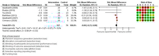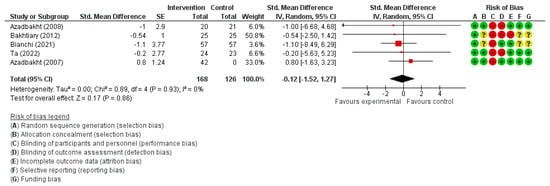 Five studies were included in this meta-analysis. The total sample size was 294 (168 in the intervention groups and 126 in the control groups; median sample size 47; range 41–114) and the mean age of the participants was 55.6 years. The median duration of the studies was 8 weeks (range 4–208 weeks). In the trials, replacement of meat with mycoprotein or plant-based meat substitutes was not associated with a significant change in weight (−0.12 Kg; 95% CI, −1.52 to 1.27; p = 0.86; I2 = 0%; p = 0.93 for heterogeneity) compared with the consumption of comparator diets (Figure 8). In the one-study-removed sensitivity analysis, weight findings had some diversity, with differences between the intervention and control groups ranging from −0.58 to 0.31 Kg (Supplementary Table S2). There was no overall heterogeneity between the included studies. The certainty of this evidence is low (Table 2).