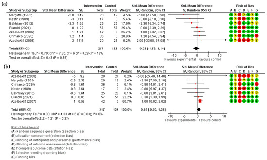 A total of seven studies were included in these meta-analyses. The total sample size was 339 (217 in the intervention groups and 122 in the control groups; median sample size 41; range 17–114) and the mean age of the participants was 50.9 years. The median duration of the studies was 8 weeks (range 4–208 weeks). In the trials, replacement of meat with mycoprotein or plant-based meat substitutes was not associated with a significant change in SBP (−0.32 mmHg; 95% CI, −1.79 to 1.14; p = 0.67; I2 = 18%; p = 0.29 for heterogeneity) or DBP (0.49 mmHg; 95% CI, −0.30 to 1.28; p = 0.23; I2 = 0%; p = 0.63 for heterogeneity) compared with the consumption of comparator diets (Figure 7). In the one-study-removed sensitivity analysis, SBP findings were diverse, with differences between the intervention and control groups ranging from −0.80 to 0.22 mmHg (Supplementary Table S2). The DBP results were similarly diverse with a range of −0.30 to 0.57 mmHg (Supplementary Table S2). The removal of one study [18] reduced the SBP effect heterogeneity from 18 to 0% and changed the mean change in SBP to 0.01 (−1.25 to 1.28) (Supplementary Table S3). There was no overall heterogeneity between the included studies for DBP. The certainty of this evidence is low (Table 2).