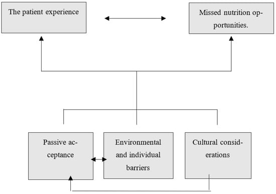 Figure 1. The interrelationship between themes is shown below. The themes of passive acceptance, environmental and individual barriers, and cultural considerations influence the overall patient experience and may also lead to missed nutritional opportunities.