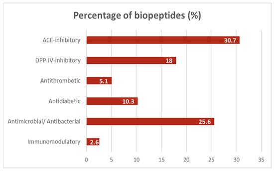 In the twelve Tsalafouti cheese samples analyzed, a total of 39 different biopeptides were detected. Out of these 39 biopeptides, 12 were inhibitors of the ACE enzyme (ACE-inhibitory), 7 were inhibitors of dipeptidyl peptidase-4 (DPP-IV-inhibitory), 10 of them were related to antimicrobial/antibacterial activity, 4 to antidiabetic activity and 2 were antithrombotic, while 3 were related to multiple biological activities (ACE-inhibitory, Antidiabetic, Antioxidant, Opioid, etc.), and finally, 1 of them belonged to the category of immunomodulatory biopeptides. The largest percentages of biopeptides detected were inhibitors of the ACE enzyme (30.7%) and biopeptides with antimicrobial activity (25.5%), (Figure 1).
